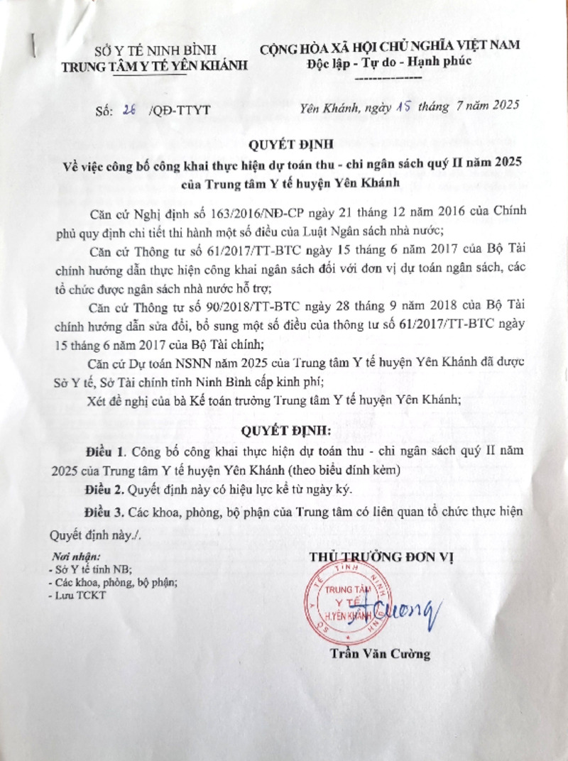 | Tiêu đề văn bản | Công bố công khai thực hiện dự toán thu - chi ngân sách Quý II năm 2025 của Trung tâm Y tế huyện Yên Khánh | ||