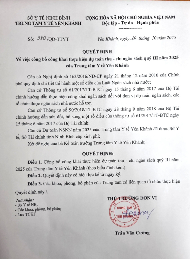 | Tiêu đề văn bản | Công bố công khai thực hiện dự toán thu - chi ngân sách Quý III năm 2025 của Trung tâm Y tế Yên Khánh | ||